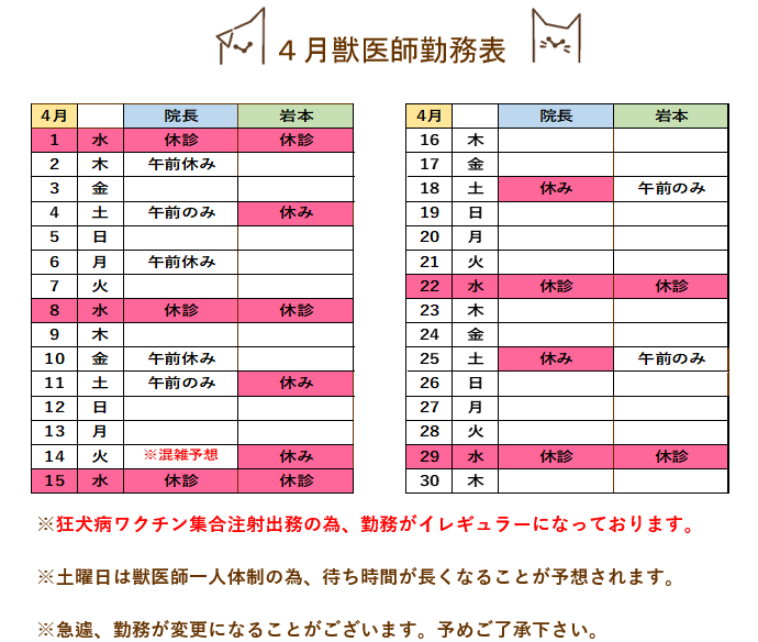 4月は狂犬病ワクチン集合注射出務などでイレギュラーになっております。